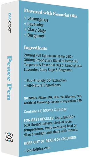 The biocbd + Peace Pen contains 200mg of extra strength, organic CBD, and 300mg of our special blend of organic hemp oil, plant terpenes, and essential oils…
